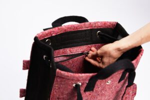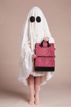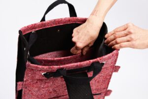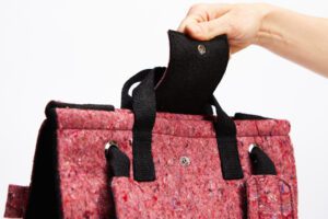 - The main material is a felt composed by clothes that could’nt be proposed in the second hand market. Made in Netherlands. Main Color : Pink and Red. Presence of animal fabrics.