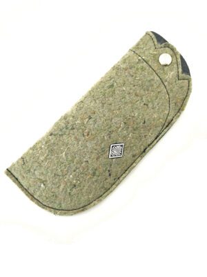 Il est composé à partir d’une feutrine recyclée dont les fibres sont issus d’uniformes de l’armée de Terre n’ayant pas de débouchés en seconde main, effilochés puis compactés et liés avec du PET recyclé. Je suis tombée amoureuse de ces coloris irréguliers et de la texture douce, rassurante et légère de ce tissu ! Quant à la matière unie au motif ressemblant à du cuir, c’est du PVTex, matière issue du recyclage de chutes de PVC  à l’assemblage de voitures, il n’y a donc PAS de cuir dans cet article. Il est 100% végane !